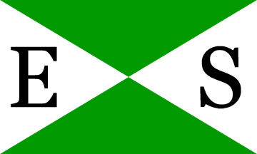 The flag is quartered per saltire, black in the top quarter, white in the bottom one and red in the other two. The white base quarter has a black sans serifed capital "S" (see left image above) or a red, serifed initial "S" (see right image above) in centre.