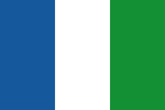 The official ceremonial flag is a tricolore Blue/White/Green flag, with a blue and green tower in the center adorned by a white star surmounting the date of creation of the Commune libre (1974) in gold. The blue and the green stripes have each four white ermine spot. The name and the motto of the Commune libre are written gold letters.