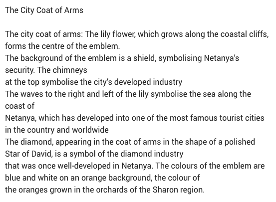 • Information about the Coat of Arms (netanya.muni.il, 2004, Hebrew [retrieved] | English translation)
