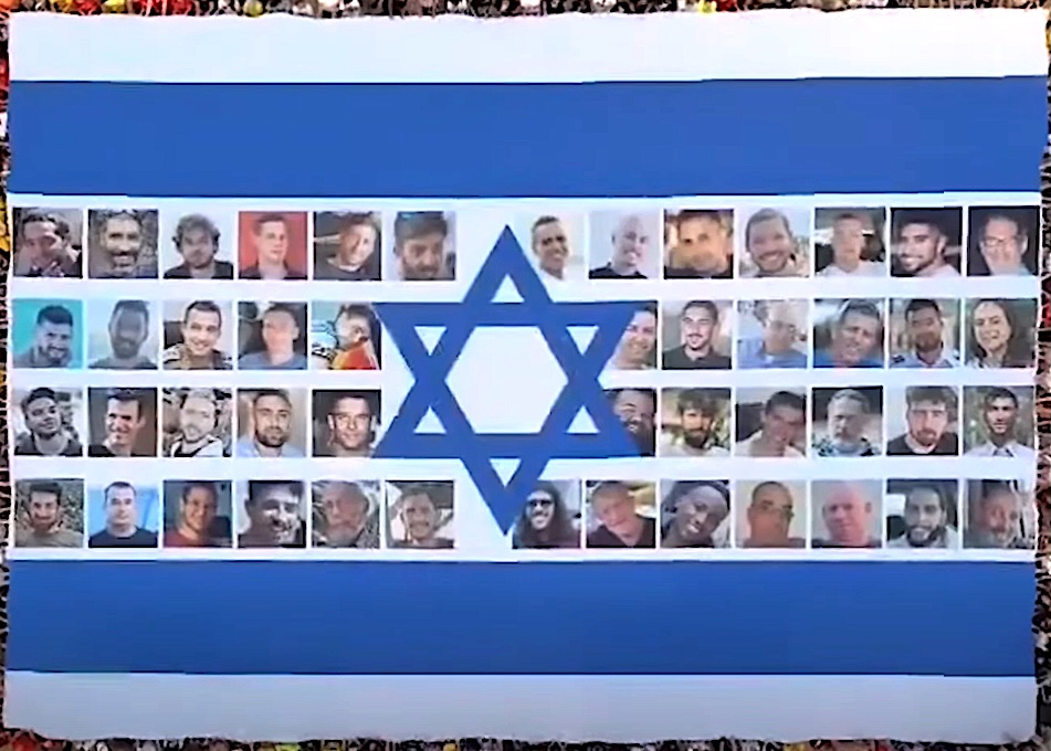 The flag shows an Israeli national flag covered with portrait photos of 48 hostages being held by Hamas.