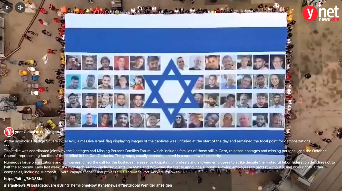 News article info (17 Aug 2025): "At the symbolic Hostage Square in Tel Aviv, a massive Israeli flag
