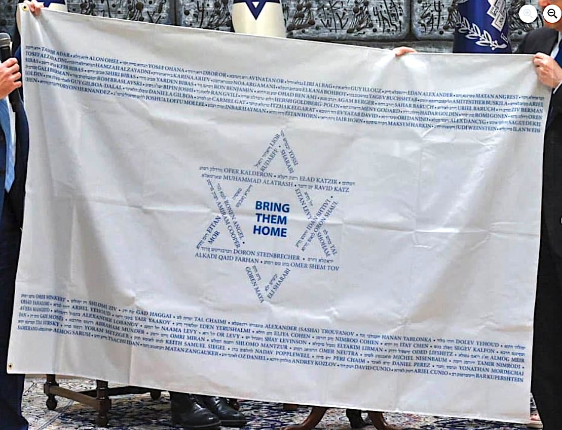 A stylized Israeli flag featuring the (251?) names of the people who were taken hostage during the October