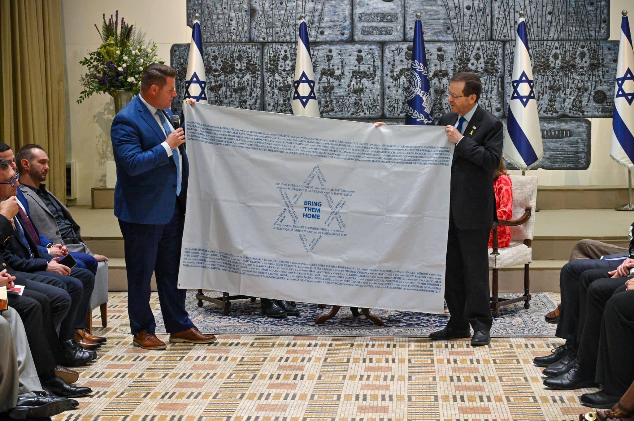 running out for the victims held by Hamas. The flag/banner was shown at a meeting between family members