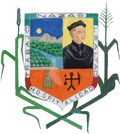 The coat of arms was adopted during the administration of 1998-2001 under Municipal President José Ángel González Soto, being given by Hipólito Arreola Chacón on 9 January 2000. Surrounding the shield to the left is a corn plant; to the right, a wheat plant as products of agriculture. Its border is in the National colors; reading at the top NAZAS. It reads the motto "TRABAJO HOSPITALIDAD LEALTAD" [Work, Hospitality, Loyalty]. To the upper-left, the Nazas River with an abundance of walnut trees by it. In its background, the sun marking the end of a culture (arrival of the Spaniards) and mountains. To the upper-right, the Jesuit Juan Agustín de Espinoza who founded a mission here. At the bottom, a fishing net (nasa) used by its first populators that remembers the origin of its name and an Indian hunter with bow and arrow.