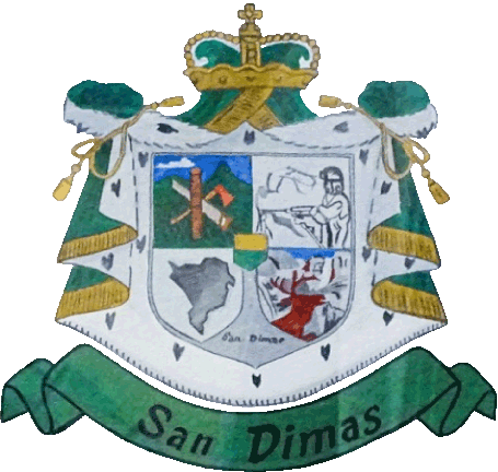 The coat of arms of San Dimas was adopted on 25 August 2005 during the administration of Francisco Favela López. Its designer is Pablo Adolfo Zamora Arellano. The shield is in a robe, symbolizing the natural wealth of the municipality and its economy. It is topped off by a crown symbolizing that it pertains to the state of Durango, as the state coat of arms has a crown too. Below the robe is a ribbon reading "San Dimas". The upper-left section of the shield carries the silhouette of the Huehuento Hill; to its front, a log, saw, and axe recognize the industry associated with exploitation of forest resources. To the upper-right is a miner in his work, recognizing the industry. To the lower-left is a map of the municipality. To the lower-right, the landscape which is filled with ravines is depicted; to the left, with little vegetation; to the left, the Piaxtla River is seen, which originates here; and to the front, the image of a deer representing its fauna. In the center, an inescutcheon in gold and green symbolizes the same as the robe in the same colors. Below this is a funnel shape reading San Dimas.