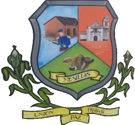 The shield has a silver border. To its sides are corn plants for agriculture. Below is a ribbon divided into three reading "UNION TRABAJO PAZ" [Union, Work, Peace]. The shield is divided into three sections. To the upper-left is a house with a soldier in front, likely for the Revolution. To the upper-right is an image of the local Temple of the Immaculate Conception of Mary. The lower section depicts a head of cattle for cattle-raising, with a ribbon reading MESILLAS.