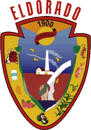 The coat of arms of Eldorado was created through a contest, won by Juvencio Leyva, a teacher and painter. It was adopted during its time as a syndicate, known to have existed as early as 2014. However, it was adopted as the municipal coat of arms in 2021. The shield is bordered in red outlined in black, taking the form of an arrowhead. At the top is the name ELDORADO. The inner section is yellow. In its outer areas, it depicts symbols of the economy, such as: cattle and milk for the cattle-raising industry; a mango, raspberries, and avocado (?) for fruticulture; corn plant, and unknown item for agriculture; salmon and shrimp for fishing, as a reminder the municipality has a coast. Surrounding the innermost scene are two stalks of sugarcane, remembering the origins of the local economy. The innermost scene depicts a sugarcane mill surrounded by fields, a reminder that the municipality was founded because of a sugarcane mill. The footprints remember the pilgrimages that the Indians took through Sinaloa. At the bottom is the San Lorenzo River, with a hand holding a machete to symbolize the efforts of the people. At the top, a sun bearing a ribbon reading its name remembers the origin of its name, "Golden" because of its sunsets, with its rays going above. The year 1900, found here, is when the community was founded.
