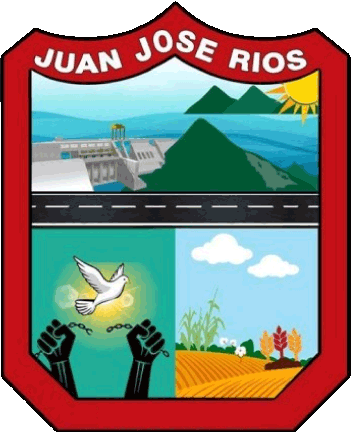 Before becoming a municipality, the syndicate of Juan José Ríos used another shield. In the top half, it depicts the Miguel Hidalgo dam, representing its history as a re-accommodation for people affected by its construction. Mountains and the sun are depicted, characteristic of that area. In the lower half, on the left quadrant, there is a shackle and dove representing the hope for municipalization. To the right is a typical image of the valley, with fields and the sky above.