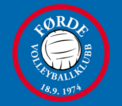 The flag of Førde VBK (Førde Volleyballklubb) from Førde in Sunnfjord Municipality, ex Førde Municipality is blue with the logo inside a red ring in the center.