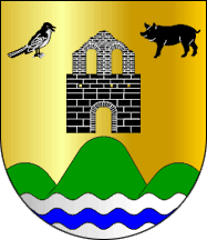 in chief sinister a pig Sable statant garnished Or, issuant from flanches and base wavy Argent, charged with a bar wavy Azure, a mound of three coupeaux Vert. Mural crown Argent with three visible towers (commune rank) and