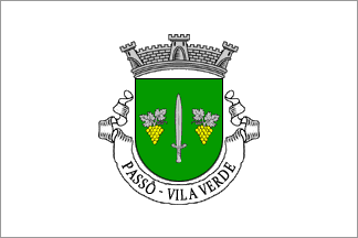 Mural crown Argent with three visible towers (village rank) and white scroll reading in black upper case serifed letters "PASSÔ - VILA VERDE".
