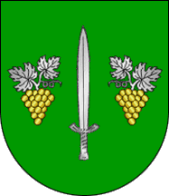 Shield Vert a sword Argent in pale, flanked by two grape bunches Or leafed Argent.