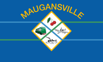 The winning design, which was designed by residents Bob Walton and Ray Wills, congratulations to them! The flag is a blue field with a white diamond with gold outlines in the center of the field. starting from the hoist are two thin lines of light blue and green, which cross over each other in the diamond and swapping on the fly side. The diamond is quad sectioned by the intersecting lines. The Cherry and the plough both refer to the agricultural history of Maugansville prior to suburbanization. The plane on the right is for the Hagerstown Aviation Museum which is due east of Maugansville. The train is for the railroad that runs through town from Greencastle to Hagerstown. The community name is arched over the diamond and lines.