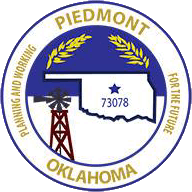 The seal is made of a white ring with the city and state names on the upper and lower areas respectively, and the slogan "Planning and Working for the Future," split on the left and right sides of the logo. In the center is the outline of Oklahoma with a star pinning the city's location with the number 73078, which is the Zip code for Piedmont. Above the state are two wars of wheat facing each other. Under the Oklahoma panhandle is a windmill.