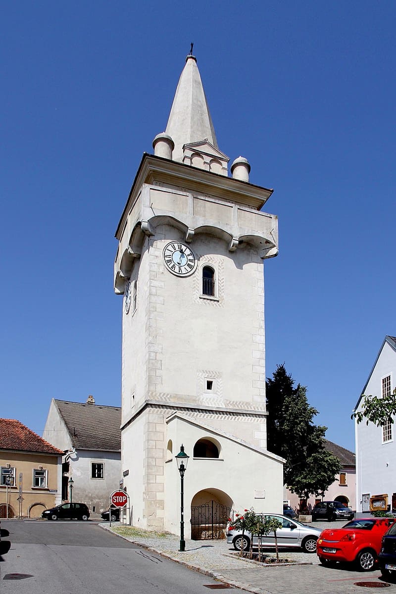 The coat of arms, granted since 1951, is dominated by the so-called "Türkenturm" (Turk Tower). The defensive tower, a remnant of the former town fortifications, was built in the first half of the 17th century, at the time of the Turkish sieges. It also symbolizes the market's jurisdiction (photo, source).