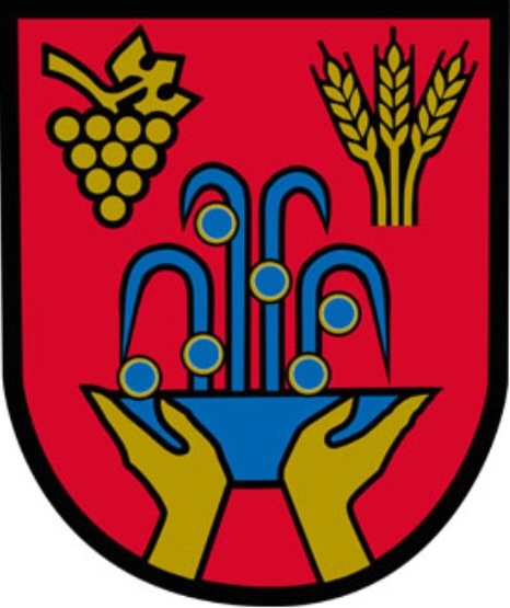 In a red shield, a blue bowl held by two golden hands, from which rises a blue fountain adorned with
