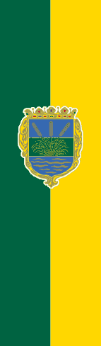 The flag is a vertical bicolor of green and yellow with the city coat of arms on it.