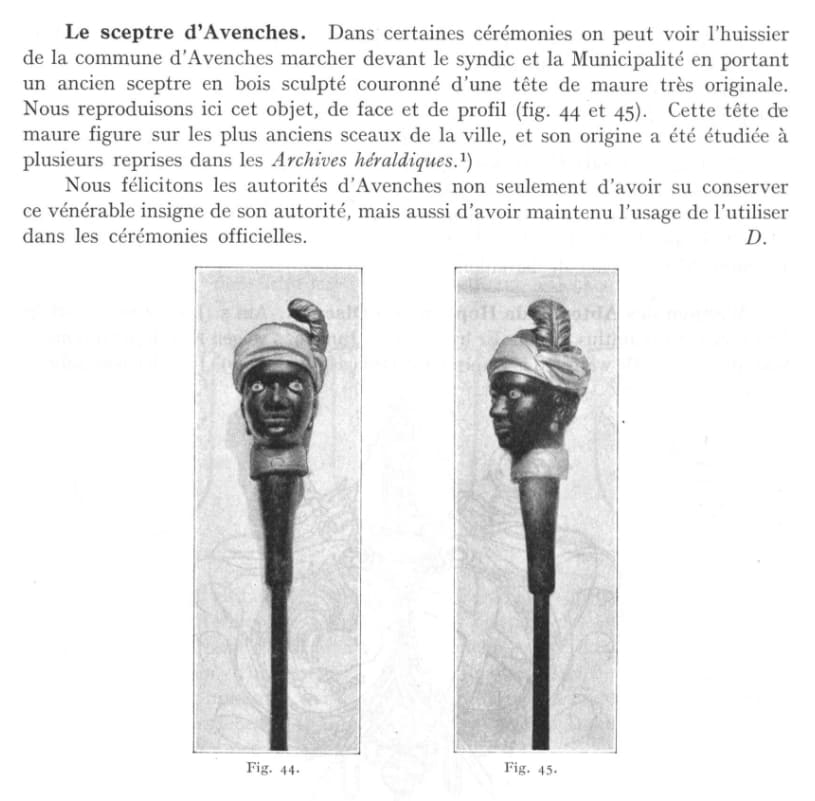 Gules, Moors head proper with a band Argent around, clothed in Azure and Or.