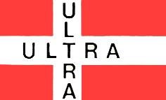 Red field, white off-centred cross, the word "ULTRA" in black letters on the white arms of the cross (vertically and horizontally, the "T" being in common, no serifs).