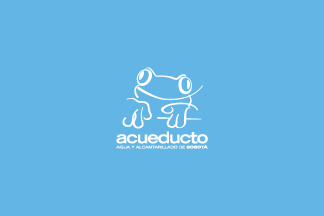 The logo depicts a frog emerging as its mascot, which thrives in water. It also has the name "acueducto" and its full name smaller underneath "AGUA Y ALCANTARILLADO DE BOGOTÁ". The symbol is in blue as a representation of water.