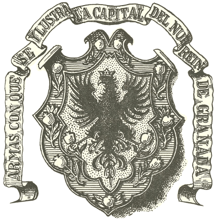 ...henceforth, the aforementioned province of the named New Kingdom of Granada, and its cities and villas shall find and have as their arms to be known as a shield, of which in the middle is a full rampant black eagle crowned in gold, of which in each hand has a pomegranate colored on a golden field, and as border some branches of pomegranate in gold over a blue field as it shall be painted and figured.