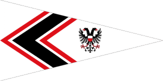The white pennant is parted by a black chevron cotized white-red pointing to hoist. On fly are the city arms of Lübeck without shield.