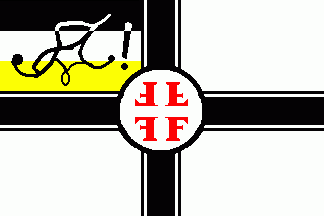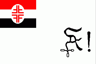 The white flag was parted by a triband in bend of light blue, white and dark blue. On lower hoist quarter was a red athletics cross, on upper fly quarter the black circle of the fraternity.