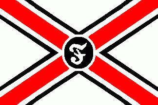 The white flag was parted by a red saltire cotized white-black.On its centre was a black disc fimbriated white with stylised white "F" on its centre.