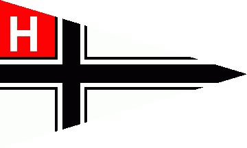 The white pennant was off-centred parted by a black cotized cross. The canton was red with white letter "H".