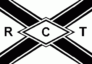 It is a white flag divided by a black cotized saltire, which is in the centre superimposed by a white lozenge with black cotised edges. In the hoist and fly quarters and in the lozenge are black capitals "R" (hoist), "C" (lozenge) and "T" (fly).