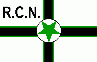 The flag was white parted by a black centred cross fimbriated green. On centre in a white disc fimbriated black was a green reversed 5-point star.