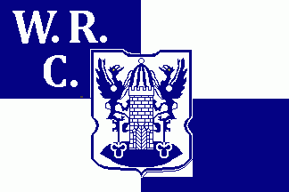 The flag is quartered of blue and white with centred city arms in flag colours and white inscription "W.R.C." in triangle on upper hoist quarter.