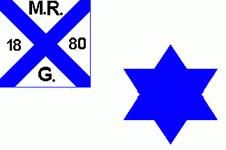 The flag was white with big blue 6-point star on lower fly. The white canton was parted by a blue saltire with black inscriptions on any quarter as follows: "M.R." (top), "G." (bottom), "18" (hoist) and "80" (fly).