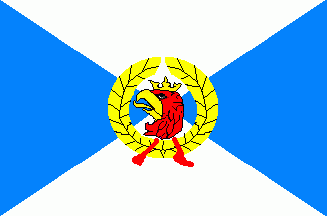 The pre-1930 flag was parted per saltire of blue and white, on centre was the crowned giffin´s head from the city arms in a golden wreath tied red.