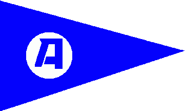 The pennant is blue. Shifted to hoist on a white disc is a blue initial "A", a bit shaped like a sail with mast.