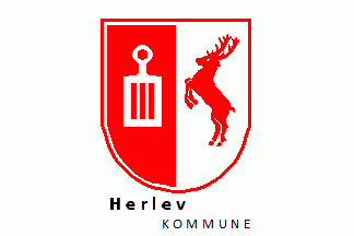>The gridiron is an attribute of St. Lawrence, patron saint of the parish church of Herlev. The roe is a canting element and representing Hjortespring, which means "jump of the roe". The version on flag is simplified as follows: the roe is not garnished black. The gaps of the gridiron have been reduced from four to three. The sinister half of the shield is cotised white-red.