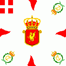 The flag was light blue with red flames and coat of arms as follows: shield parted per fess: above at dexter Or three lions passant Azure in pale surrounded by nine heartlets Gules (for Denmark),
