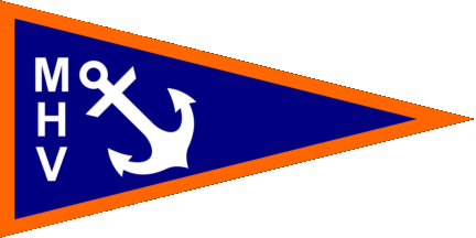 The pennant is blue fimbriated orange, at hoist is a white inscription "MHV" ordered vertically and a white anchor in bend. The club is based in Greve Strand.