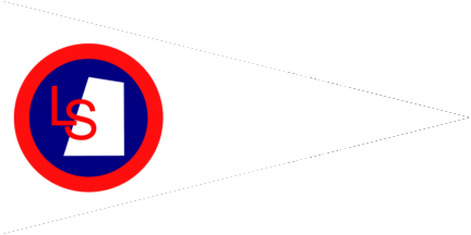 The pennant is light blue with a white sailing ship without hulk at hoist and black initials "L" and "S" flanking black steering wheel.