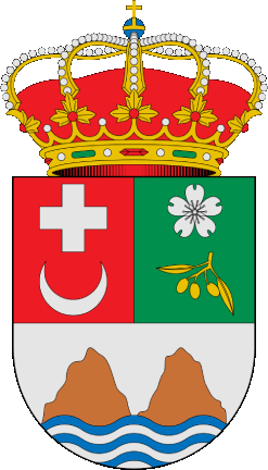 Description: "Spanish shield, divided per pale and per fess; 1st gules, crescent and cross argent placed vertically; 2nd vert, almond blossom argent and olive branch or also placed vertically; 3rd argent, two mounts proper; in base, 3 wavy fesses azure. Crest: closed Spanish royal crown."