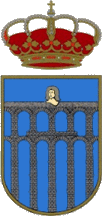 The coat of arms of the town [image] is of Spanish shape, fimbriated in gold, of rectangular, oblong and rounded-off in base, shape, azure a two- staged aqueduct argent masoned sable ensigned with a human head proper standing on rocks of the same [not represented on the images]. The shield surmounted by the Royal Spanish crown, without any other external ornament.