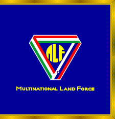 Also known as the "Trilateral Brigade," the Multinational Land Force is a regional peacekeeping unit formed by Hungary, Italy and Slovenia in April 1998. Its flag can be seen in a photo taken at some point in Kosovo: medium-blue and squarish, with a triangular ribbon in its center, point down, nestling the acronym MFA with the letters shaped into a yellow disc. The ribbon's three sides are the three constituent countries' flags (Hungary and Italy are oddly identical.) Below the emblem the text MULTINATIONAL LAND FORCE on one line in gold caps.