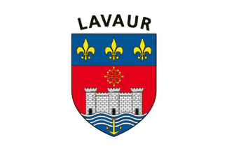 The arms of Lavaur are blazoned: Gules a castle with three towers Argent masonned of Sable, on a river of Azure and Argent issuant from the base and charged with an anchor Or, the castle surmounted of a cross of Toulouse of the same, the chief Azure three fleurs-de-lis Or.