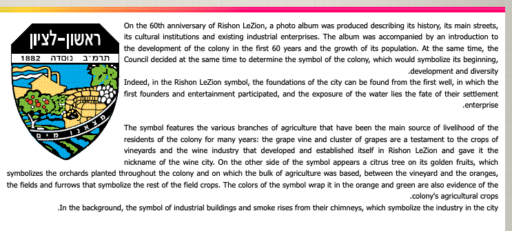 1) When Rishon LeZiyyon's 60th anniversary was approching, the local council decided to order an emblem for the colony which will give prominence to its beginning, development and its multicoloured.