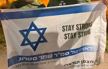 bottom blue stripe in white reading "לאורו של סמ"ר שחר סטרוג"
