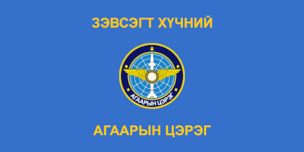 Flag of Air force is light blue, and displays emblem of the Air Force and inscription in Mongolian cyrillic says "Air Force of the Armed Forces".