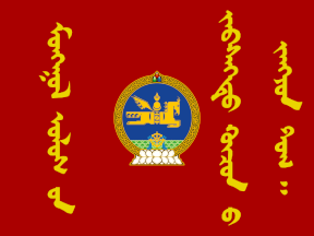 The current pattern of Mongolian Armed Forces colours, while insipired by the national flag, is a throwback to the traditional Mongolian flag design. Red field, proportions (width or height to length) 2:1, bearing the unit name in vertical Mongolian script, sometimes underneath the Soyombo, both in yellow; three narrow blue streamers with triangular ends, the length of each streamer being half the length of the field, attached to the top, middle and bottom of the fly.