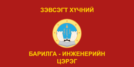 Flag of Construction and Engineering Force is dark red and displays emblem of the Construction and Engineering Force and inscription in Mongolian says "Construction and Engineering Force of the Armed Forces".