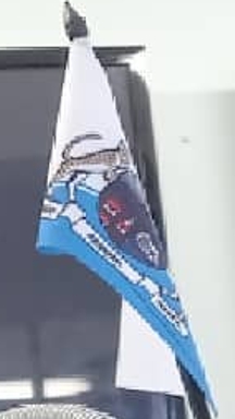 The council flag is white with blue stripes stretching from the hoist and forming the blue field in the lower part of the flag and thin blue and white lines between two fields. In the middle is the council coat of arms.