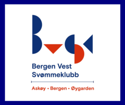 The flag of Bergen Vest Svømmeklubb from Bergen is white with a blue border and the logo centered. The Bergen Vest Swimming Club (BVSK) has activities in Bergen municipality, Øygarden municipality and Askøy municipality.